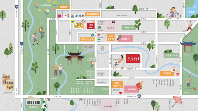 步行約5分鐘即可抵達學區及中正路商圈,全聯超市、寶雅亦僅約需3分鐘車程,約10分鐘即可以抵達國道10號旗山交流道,南來北往、交通超便利! 欲了解詳情請電話洽詢 (07)681-0998,或至 高雄市美濃區中正路一段6號 參觀。 河美苑2-facebook 預約賞屋
